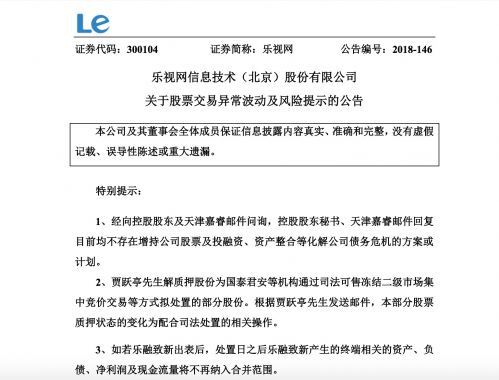 乐视网昨日发布关于股票交易反常动摇及危险提示的公告,公告显现,现在尚不存在化解公司债务危机的方案或方案。公告称,公司股票交易价格于2018年9月25日、26日、27日接连三个交易日收盘价格涨幅违背值累计到达20%以上,归于股票交易反常动摇的状况。